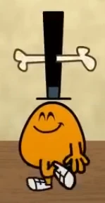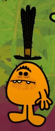 He looks like Mr. Small except he has a bone tangled up his hat is shaggy and bent at the top, a bushy unibrow, huge eyes with bags, big teeth, a shaved beard, no shoes, and hair growing on his skin.